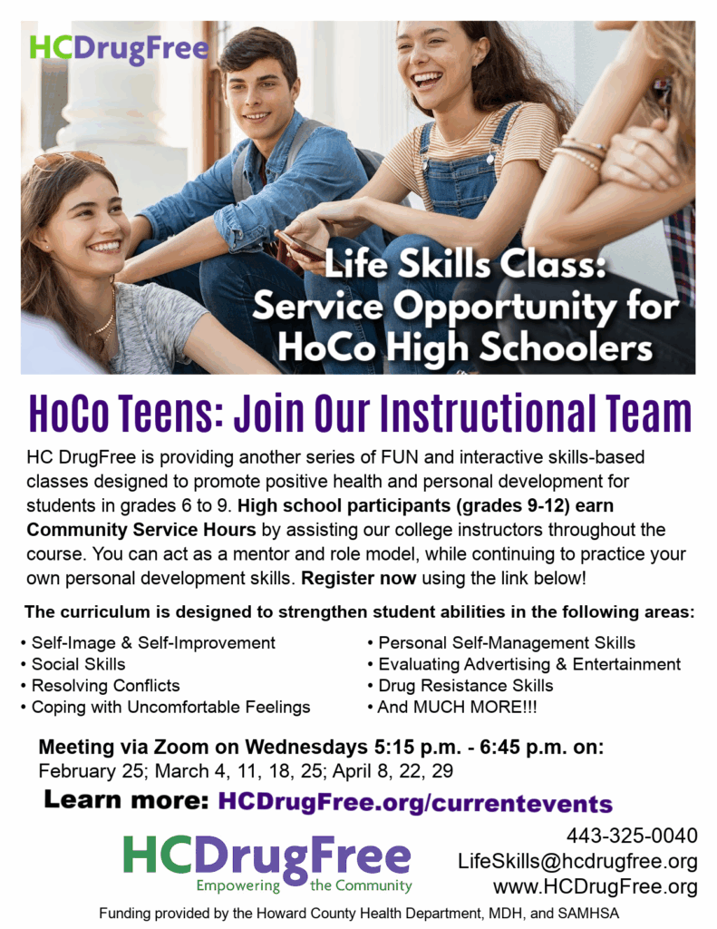 Classes provided by HC DrugFree with funding from the Howard County Health Department, the MD Department of Health, and SAMHSA.