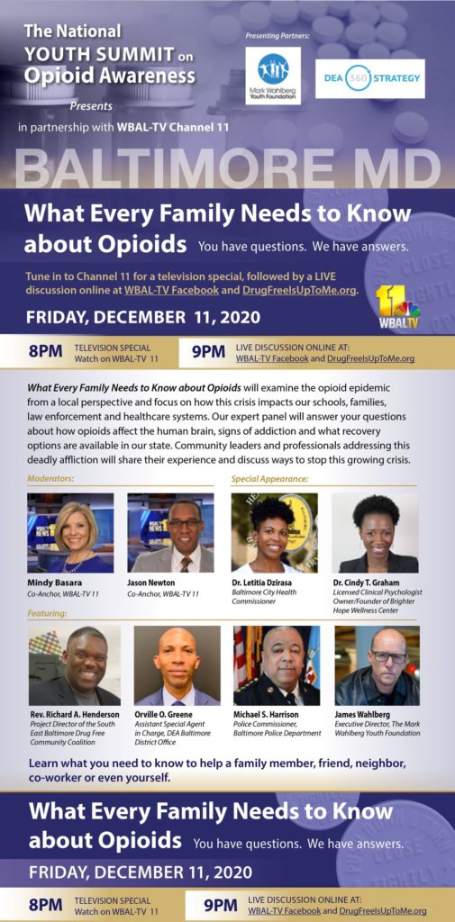 With this as the backdrop, DEA 360 and the Mark Wahlberg Youth Foundation are organizing a series of Virtual Town Hall discussions addressing the core topic of “What Every Family Needs to Know About Opioids.” In many cases, we will be partnering with a local television station to conduct a television special on the topic, after which we will continue the important discuss online. Local leaders and prevention and treatment advocates will discuss the epidemic and its impact in the community and provide insight into local resources available to assist anyone dealing with any form of substance abuse. These experts will also take questions from the viewing audience. Anyone can register to receive program notifications about the Town Hall in your community.